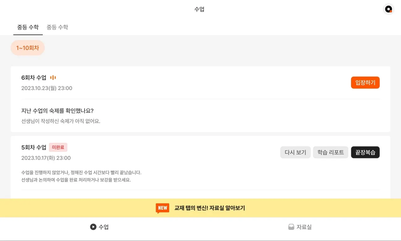 진행한 수업에서 ‘끝장복습’ 버튼을 누르면 선생님이 출제한 유형을 확인할 수 있어요. 버전에 따라 ‘토탈 클리닉’으로 보일 수도 있으니 확인해 주세요!