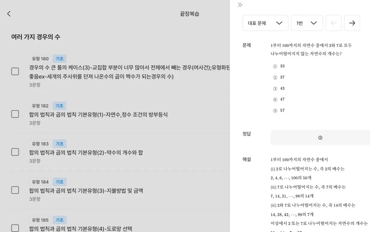 한 과목마다 시중의 유형 문제집 약 2권 분량의 문제들을 보유하고 있습니다.