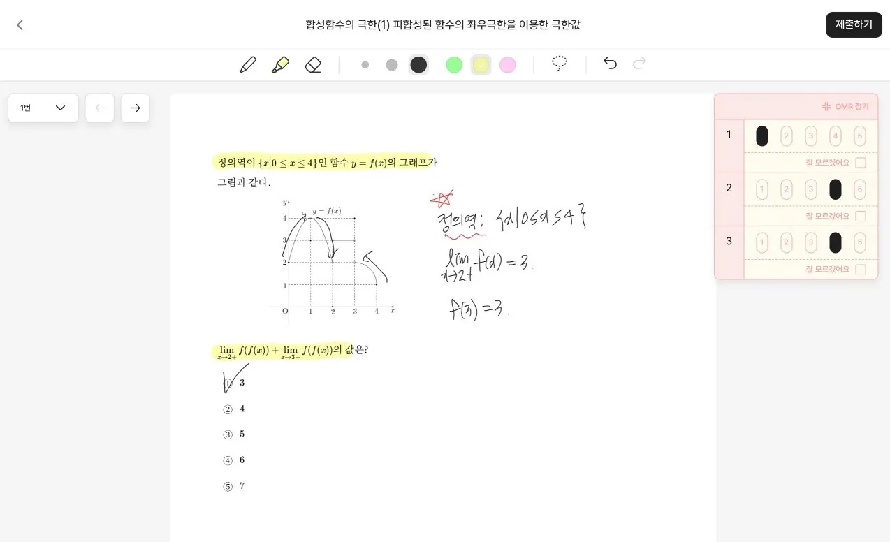 OMR에 모두 마킹한 후 제출하기 버튼을 누르면 채점 결과를 볼 수 있습니다.