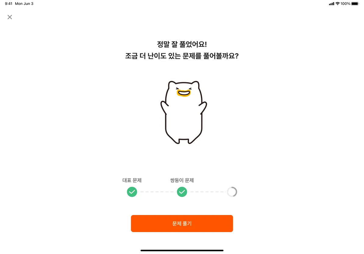 유형별로 기본 3문제가 주어지고 문제를 틀리면 쌍둥이 문제, 맞으면 응용 문제가 만들어집니다. 따라서 내가 맞고 틀림에 따라 푸는 문제의 종류와 난이도, 개수가 조금씩 달라집니다.