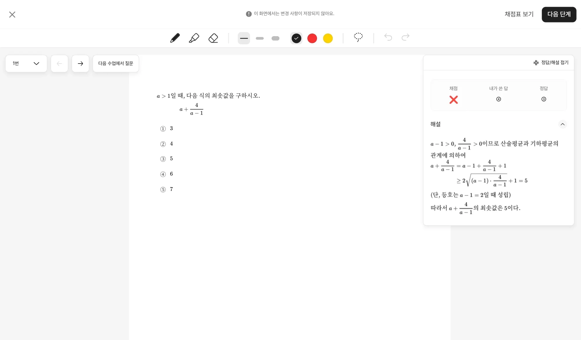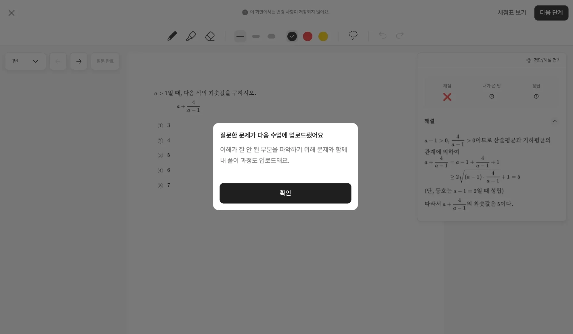 해설이 나와 있는 화면에서 ‘다음 수업에서 질문’ 버튼을 누르면, 해당 문제가 선생님께 자동으로 전달됩니다.