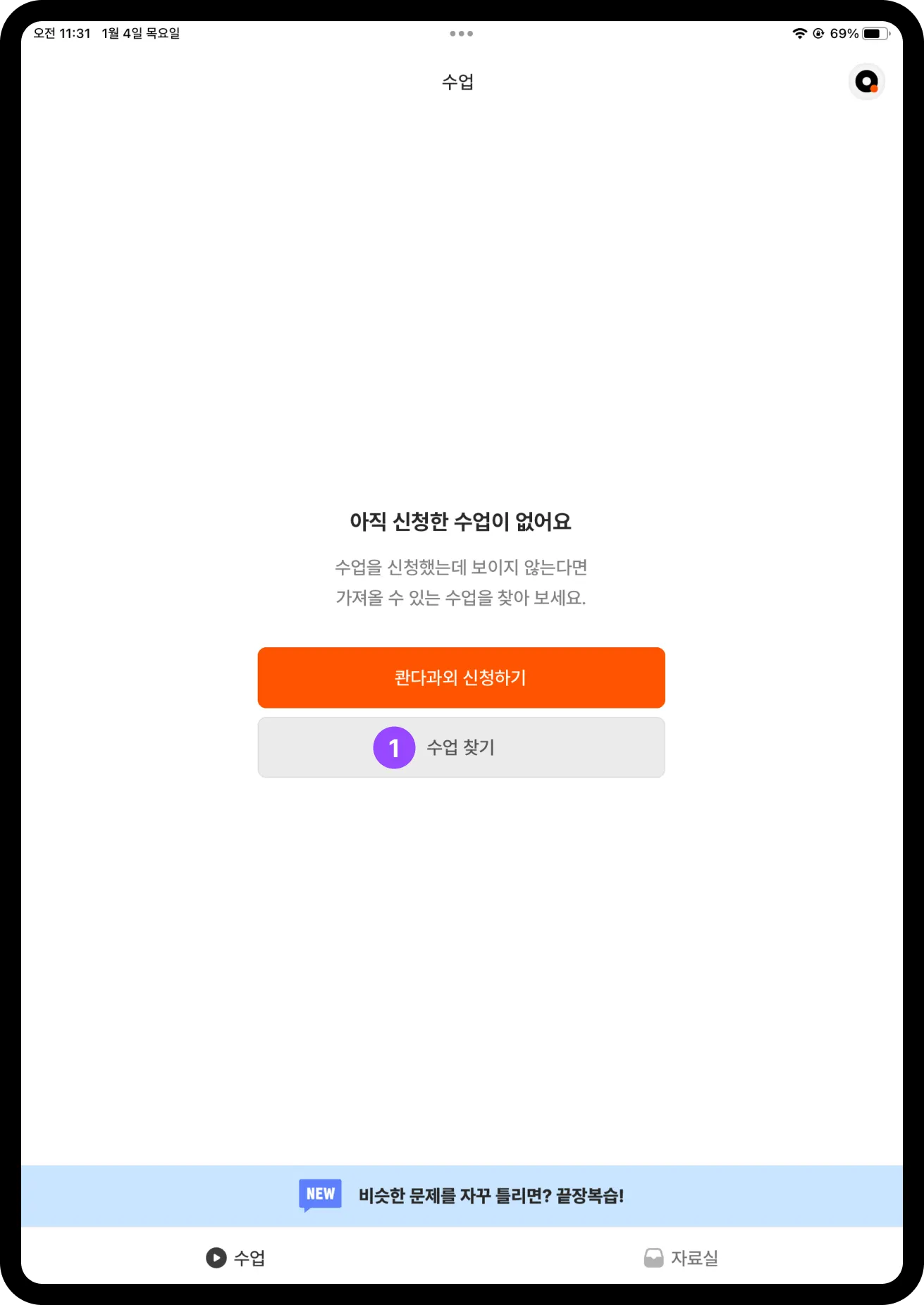 먼저 학생 계정으로 콴다과외 앱에 새로 회원가입하고, 로그인해 주세요. ‘아직 신청한 수업이 없어요’라는 안내가 보인다면, 수업 찾기 버튼을 눌러 주세요.