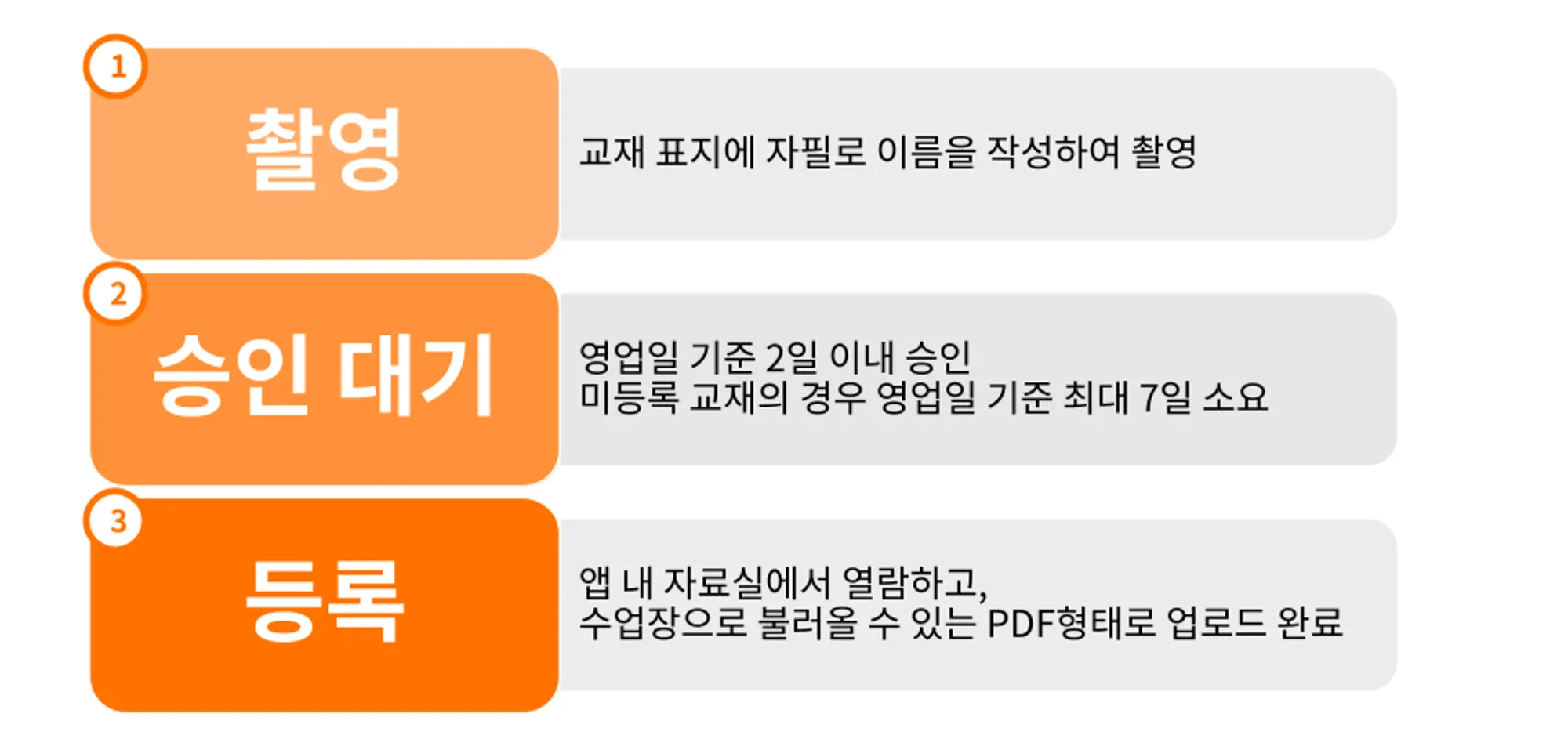 교재 등록에는 일반적으로 2일(주말 및 공휴일 제외)의 시간이 걸려요. 이를 고려해 미리 준비하고 등록해 주세요!