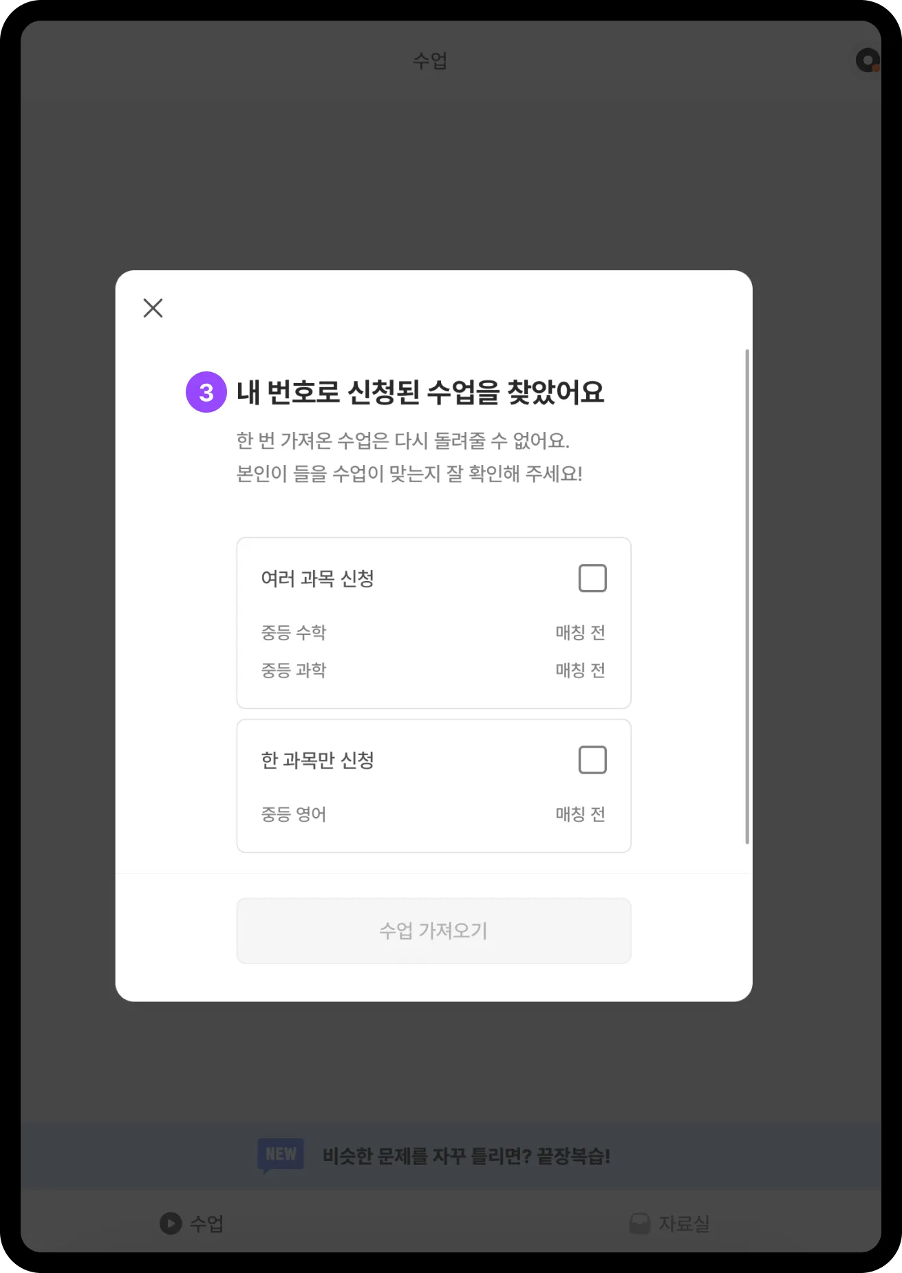 콴다과외에서 사용하는 교재는 아래와 같이 크게 3단계에 걸쳐서 등록이 진행돼요.