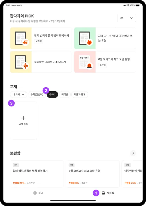 화면을 아래로 내리면, 중간 부분에 [교재] 영역이 있어요.