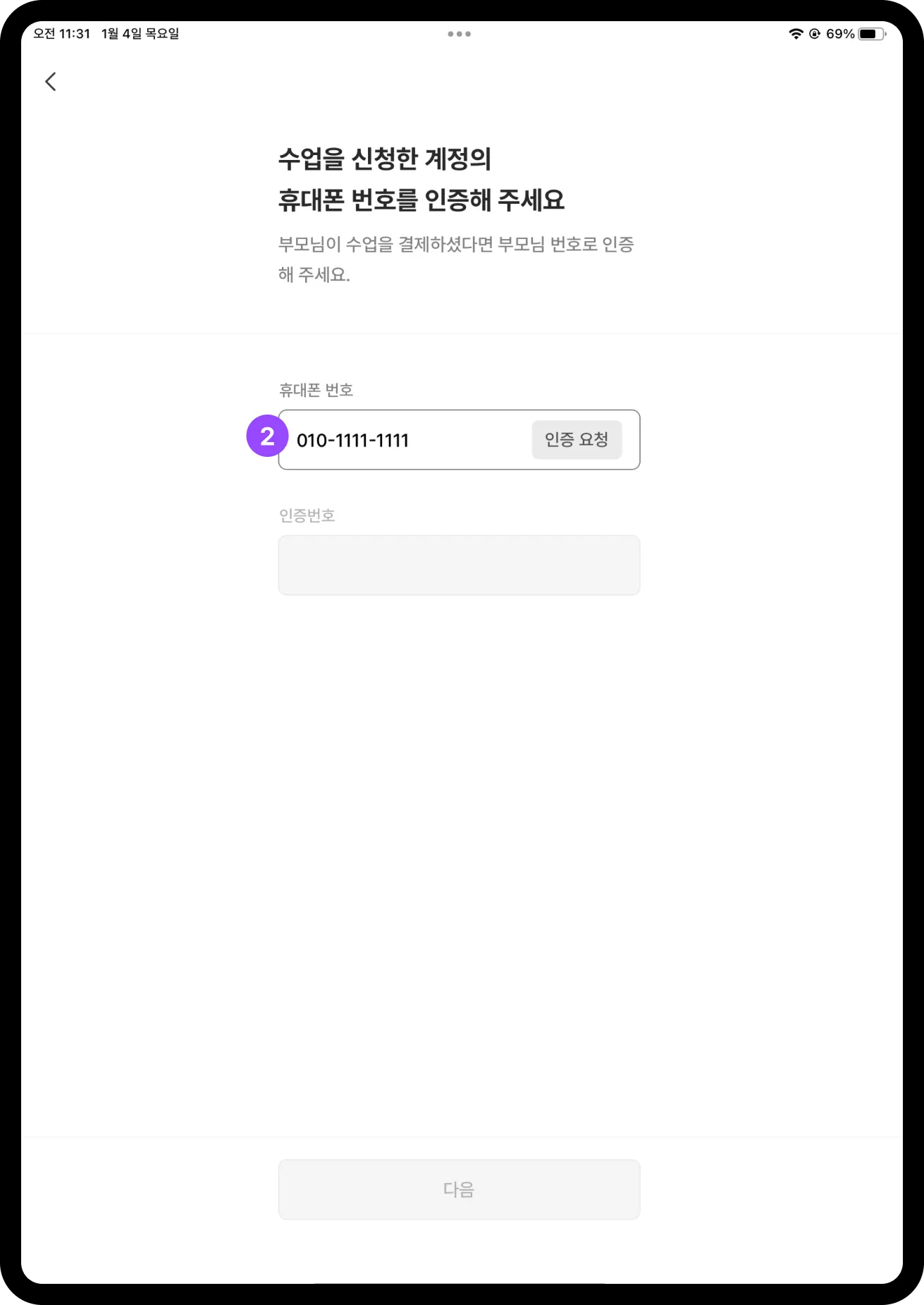 회원가입 시 입력하신 학부모 님 휴대폰 번호를 입력하고 인증해 주세요.